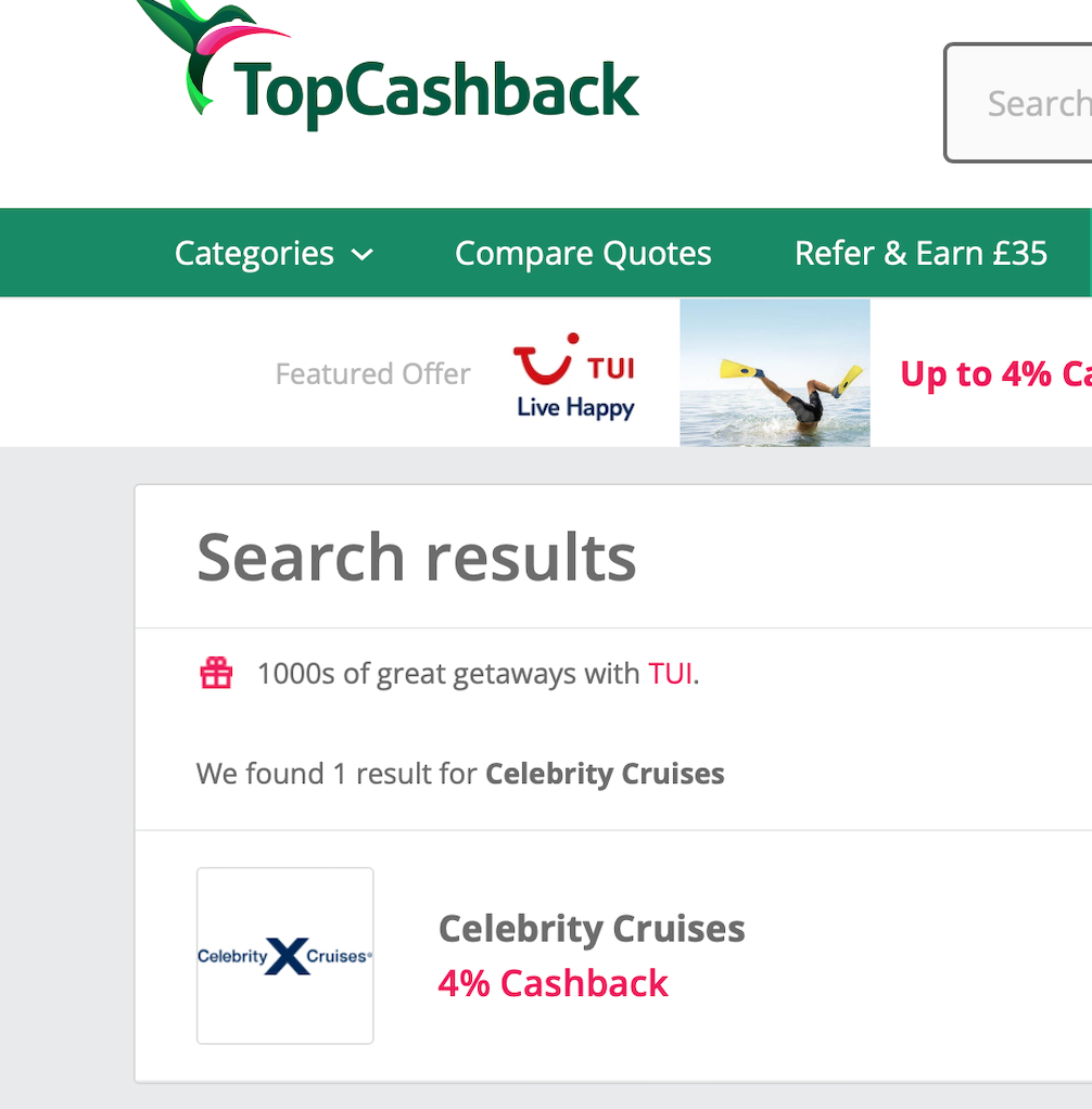 In past times, Royal Caribbean and Celebrity Cruises used to appear on TopCashBack. However, Royal Caribbean removed themselves from the platform, , and Celebrity has recently made a come back. Celebrity at the time of writing is offering 4.2% cash back. On a bargain cruise, that could equate to £40 or more.
